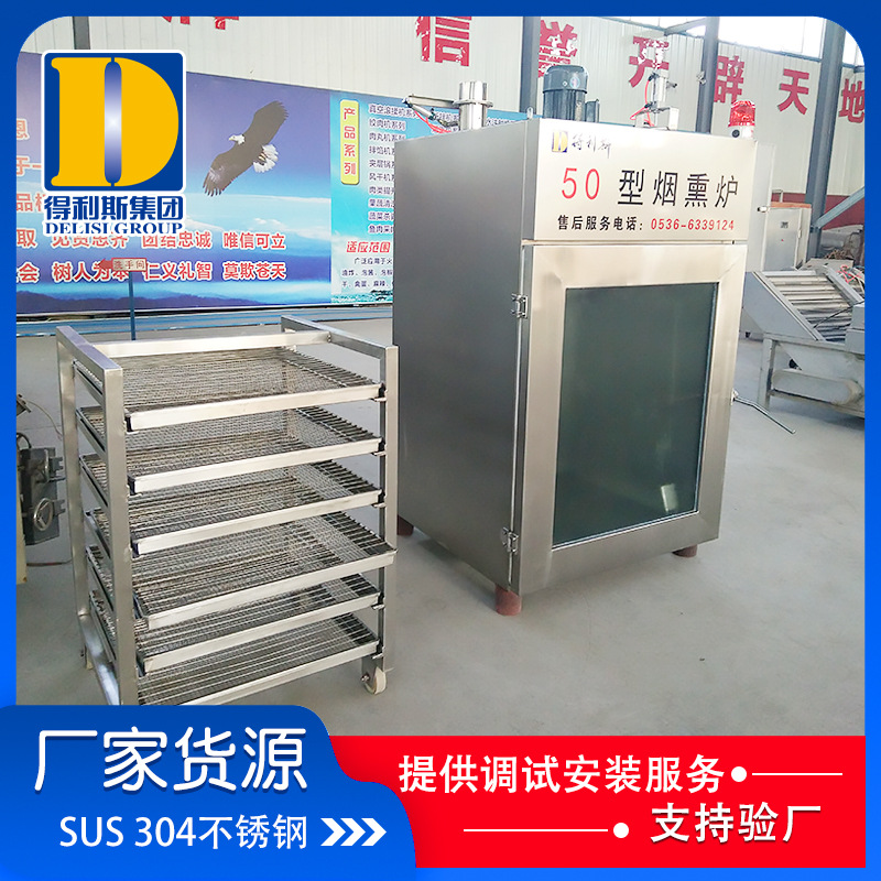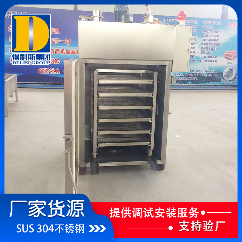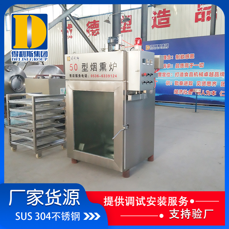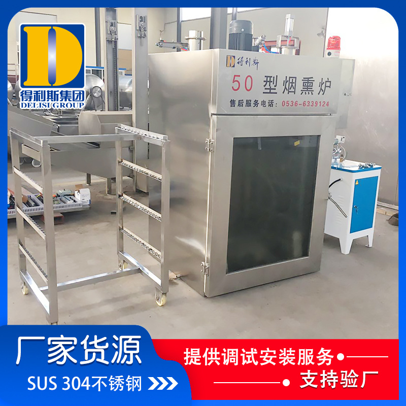 全自動煙熏爐的發煙系統: 外置式木粒、木屑發煙系統,不僅使產品產生果木香氣,而且可以使產品熏成由淺入深的金黃色。外置全自動煙熏爐分體式糖爐發煙系統,可熏制傳統的中式產品,產生糖熏味道,并且顏色可以控制,深可以成為棗紅色。兩種發煙系統同時使用能產生煙熏香氣和顏色。門上木粒發煙系統,采用世界上先 進的內循環發煙工藝,低氧狀態發煙,縮短煙道長度,降低能耗,減少設備占地面積。材質、保溫 箱體結構以單車為單元,可以拼裝成不同的組合。材質采用進口SUS304不銹鋼拉絲扳。保溫層采用進口聚氨酯保溫材料,耐高溫一次成型,保溫性能好??刂圃骷?PLC、人機界面、電磁閥等關鍵元器件采用進口產品。加熱方式 采用外接蒸汽加熱或電加熱方式。配備在線清洗系統。門鎖和門合頁及密封條設計合理,密封嚴密,操作方便。生熟區門互鎖,區域隔離,符合HACCP要求。